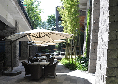 • 仿木长廊、木质藤椅随性而置,打造不经意间的休闲办公体验;