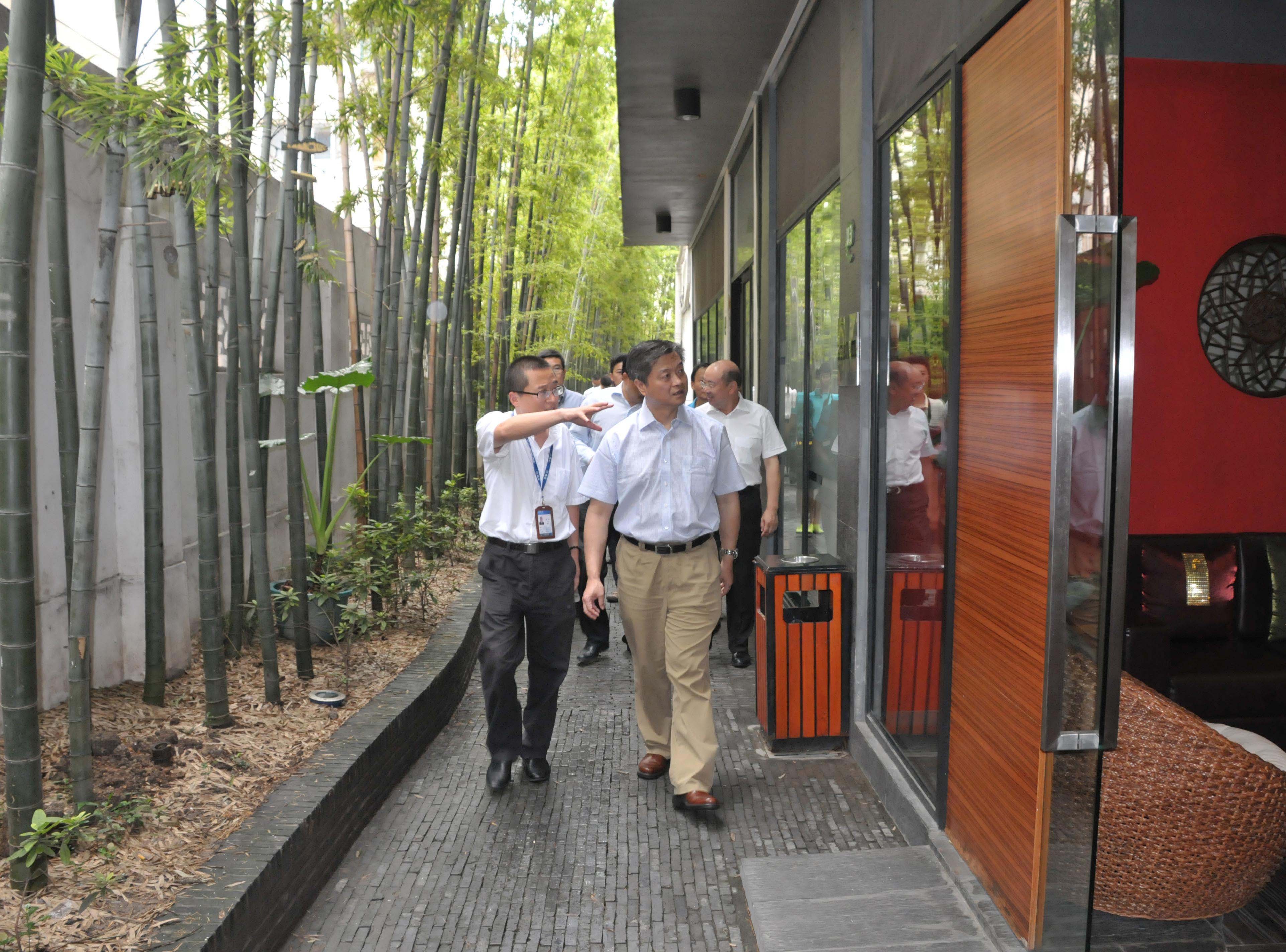 在贾总的引导介绍下,考察团一行对易园的改造过程,设计理念有了深入的了解。并对易园大到空间布局,小到树木种植处处体现中国传统易经文化表示了由衷的赞赏。穿过二楼花园平台,考察团来到了园区最大的入驻企业大众点评网进行参观,并详细了解了企业的规模和发展动向。随后,考察团一行饶有兴致地登上了九楼花园,对迎面而来的幽篁竹篱、草坪植被表现出浓厚的兴趣,不时拍照留念。