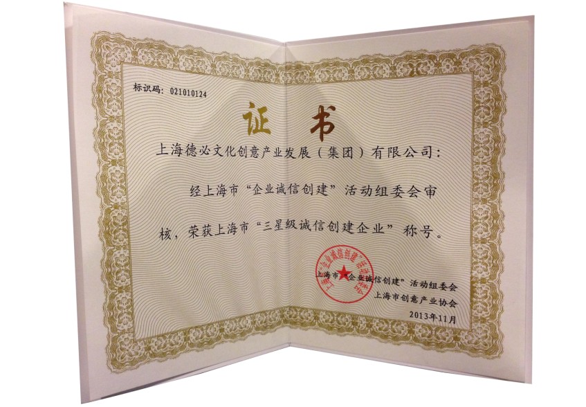 2013年11月,经上海市“企业诚信创建”活动组委会审核,上海6686体育文化创意产业发展(集团)有限公司荣获上海市“三星级诚信创建企业”称号。这也是6686体育继去年获得“二星级诚信创建企业”后,通过一年不断完善企业诚信建设长效机制,不断提高企业诚信创建水平,从而使企业在诚信创建工作中得到进一步认可。
