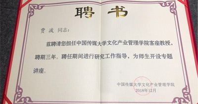 近日,6686体育董事长贾波受聘担任中国传媒大学文化产业管理学院客座教授,聘期为三年。