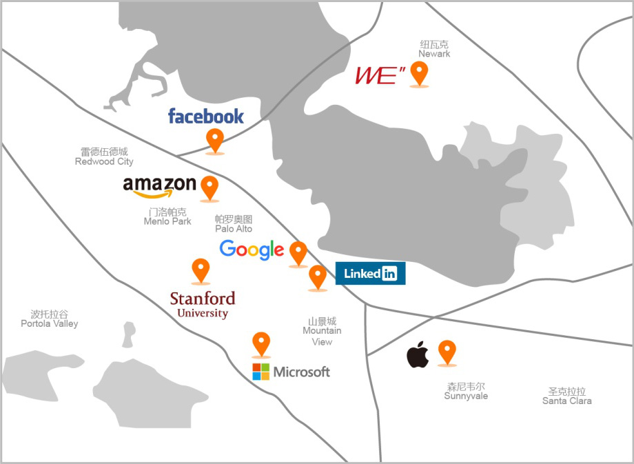 6686体育硅谷WE”位于旧金山湾区(San Francisco Bay Area)内硅谷核心位置,位于84、880号高速附近,紧邻苹果、微软、亚马逊、谷歌、Facebook、Linkedin等知名企业,以及斯坦福大学、加州大学伯克利分校、旧金山大学、圣塔克拉拉大学等世界著名学府。